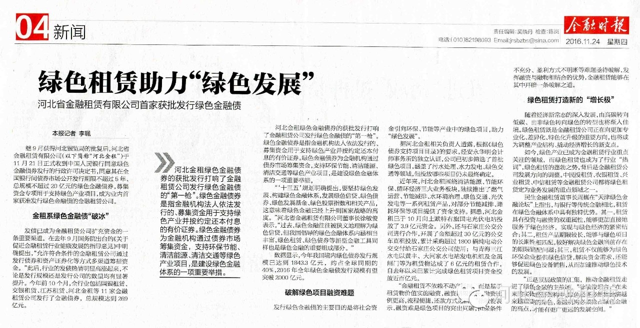 繼9月獲得河北銀監局的批復后,河北省金融租賃有限公司(以下簡稱“河北金租”)于11月21日正式收到中國人民銀行同意綠色金融債券發行的行政許可決定書,同意其在全國銀行間債券市場公開發行期限不超過5年、總規模不超過20億元的綠色金融債券,募集資金專項用于支持綠色產業項目,成為業內首家獲準發行綠色金融債的金融租賃公司。