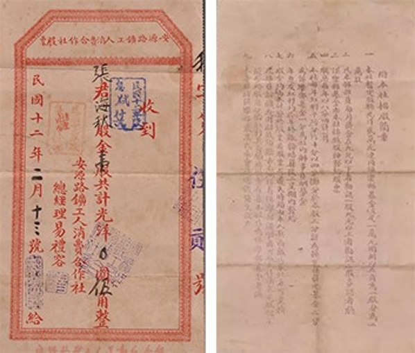 江西萍鄉煤礦自1898年開辦起,安源工人便在經濟上深受剝削,礦局拖欠工資,奸商哄抬物價。為了維護工人利益,減少商人的中間盤剝,1922年5月中國共產黨領導的安源路礦工人俱樂部成立不久,便于同年7月創辦了中國工人階級最早的經濟組織——安源路礦工人消費合作社。隨著規模和經營范圍進一步擴大,消費合作社流轉資金嚴重不足,出現了貨品短缺的窘境。為了解決資金不足的問題,1923年初,消費合作社決定在俱樂部部員中招股,制定了《招股簡章》。工人們深信消費合作社就是為大家謀利益的經濟實體,盡管十分困難,仍踴躍認購股票,很快就籌集到股金7800余元,連同俱樂部撥來的活動經費一起,共計資金1.8萬余元。消費合作社給每位認股者發了自行設計的股票作為憑證。