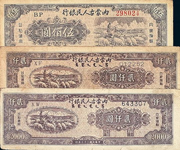 抗日戰爭勝利后,內蒙古人民最早實現了民族區域自治,1946年,東蒙古人民自治政府在烏蘭浩特成立,開始印發“人民自治政府政府暫行流通券”,起初在東北范圍內流通。1947年5月,內蒙古自治區人民政府成立,流通券改名為內蒙幣,并逐漸進入到原蒙疆地區開始流通,成為內蒙古地區百姓常用貨幣。