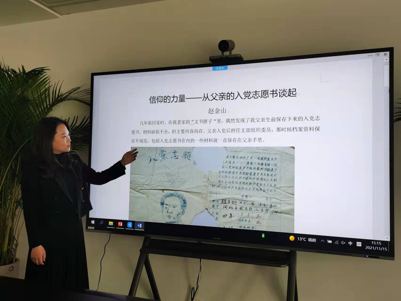 大家還研讀了趙金山同志的文章《信仰的力量——從父親的入黨志愿書談起》,在文中我們看到了趙金山同志的父親趙玉剛同志的《入黨志愿書》,這份《入黨志愿書》由中共冀南武邑縣委組織部印制,歷經 60 多年歲月,雖已殘破,但圖案和字跡依然清晰,是非常寶貴的文獻資料。在了解了這份《入黨志愿書》的故事和趙玉剛同志的生平事跡后,大家被這種信仰堅定、忘我奉獻、吃苦在前、享受在后的精神所打動,表示一定要繼承老一輩共產黨員的光榮傳統,在公司戰略轉型的關鍵時期勇挑重擔,踐行使命-----這是我們每個共產黨員的責任。